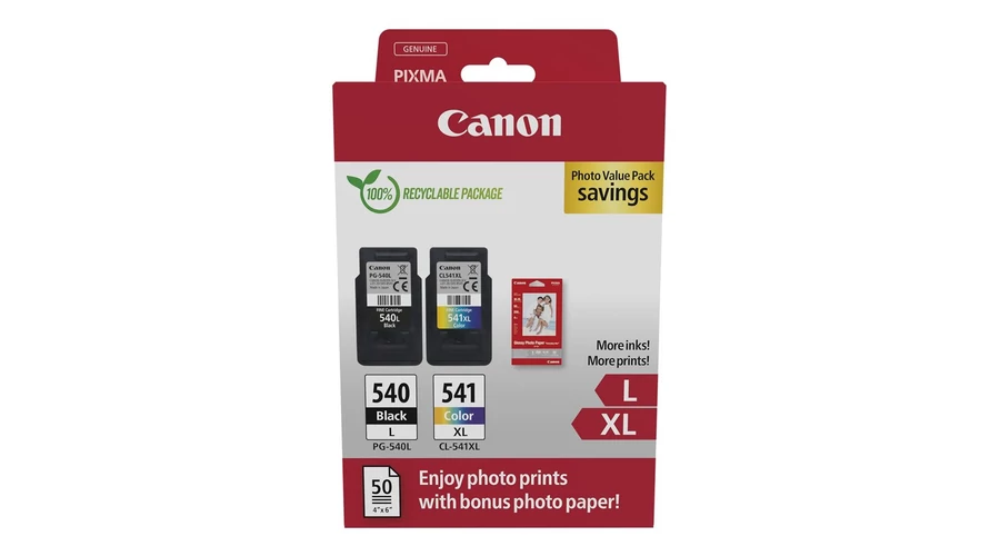 - A csomag tartalma: 1db PG-540L fekete tintapatron, 1db CL-541XL színes tintapatron és 50db glossy 10 x 15 cm-es fotópapír.